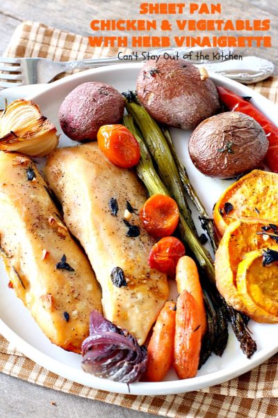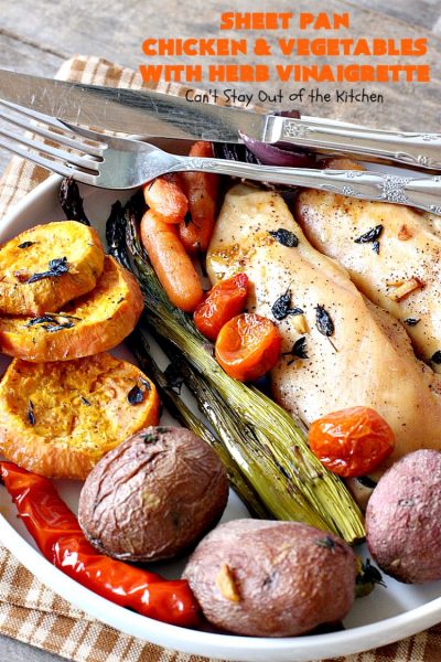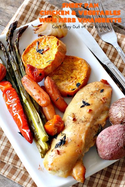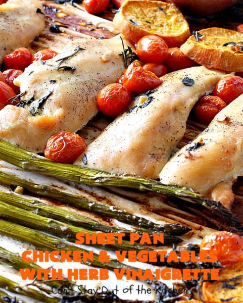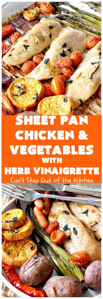 One of the nice things about this entree it’s a clean-eating recipe that’s healthy, low calorie and gluten free. It’s a hearty, satisfying, filling meal that tastes like a million bucks! Yet, it’s much lower in calories than many casseroles or other pasta-type entrees. If you enjoy roasted chicken and vegetable dinners, then Sheet Pan Chicken and Vegetables with Herb Vinaigrette is a marvelous option. Prepare yourself for a lick-smacking recipe that everyone will love.