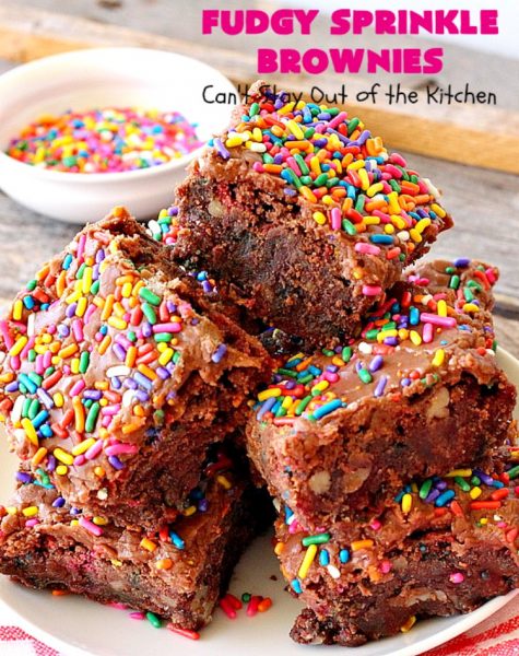Wow, Fudgy Sprinkle Brownies are to die for. Yes, a really trite saying, but truly these brownies are terrific. They start with my favorite Brownie recipe and include a few twists and turns along the way. I included a ton of sprinkles in the brownie batter as well as dumping them on top of the luscious fudge frosting. Overkill??? Not on your life! š