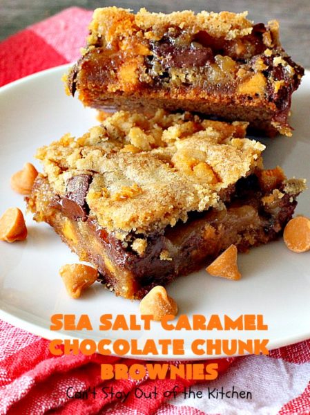 Enjoy a stack of Sea Salt Caramel Chocolate Chunk Brownies today!
