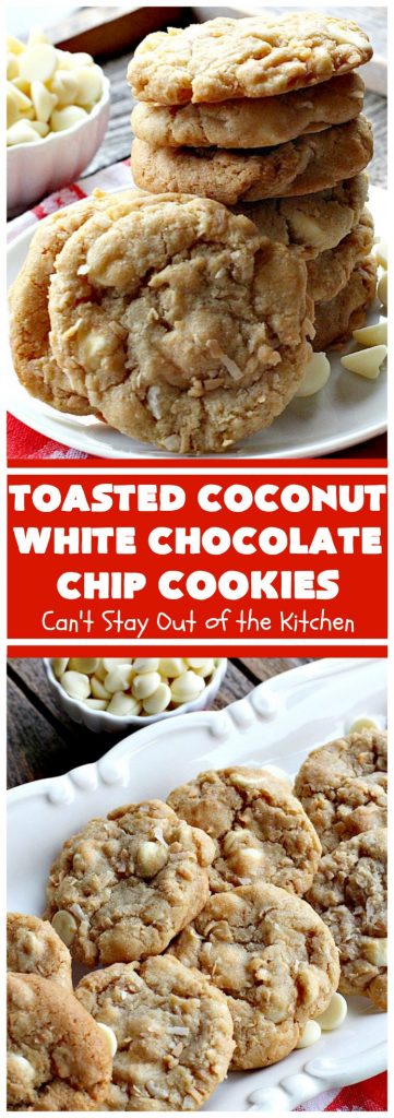 Toasted Coconut White Chocolate Chip Cookies are excellent for holiday baking and Christmas Cookie Exchanges, too.