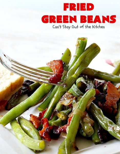 Oh my goodness, these Fried Green Beans are the BEST! I will probably take hits from my family members for saying so. But these green beans are even better than my Mom’s recipe–and that’s saying something. š Believe me, I never thought any green bean recipe could be as good as Mom’s, but this one is. The key difference is not adding water to the beans while cooking. Instead, the beans are covered while cooking, and the steam from cooking drips down into the beans. It’s utterly fantastic.