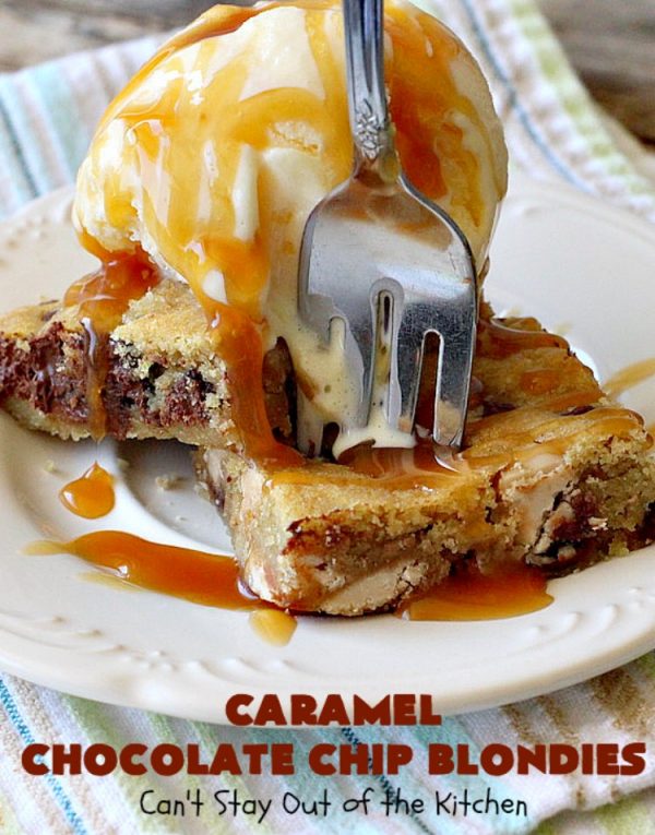 Caramel Chocolate Chip Blondies are marvelous with a little ice cream and caramel sauce drizzled over top.