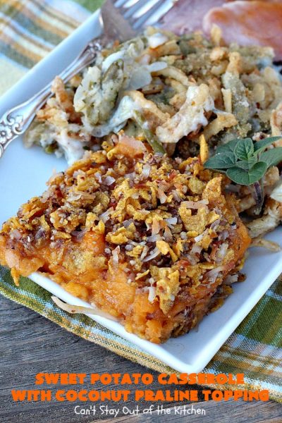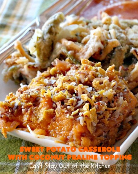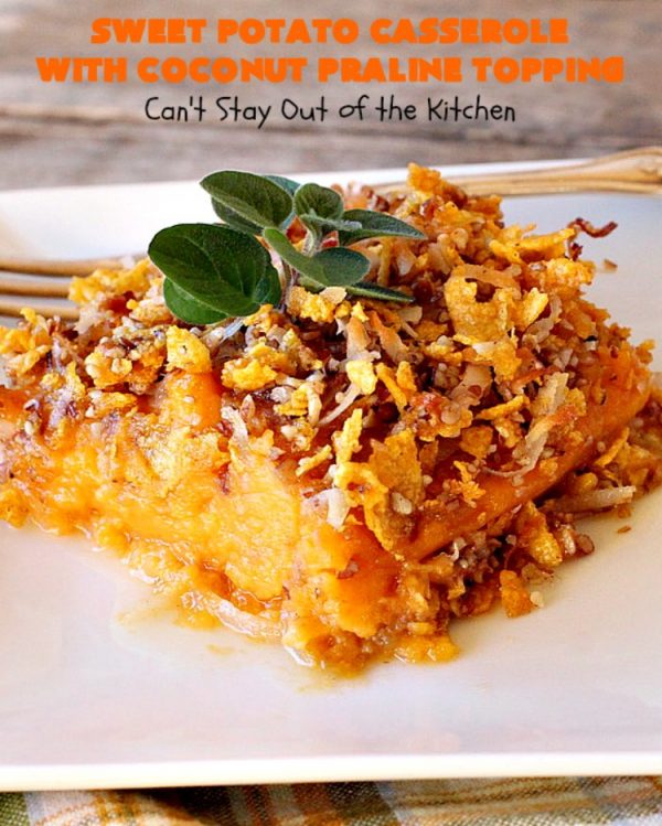 Sweet Potato Casserole with Coconut Praline Topping is terrific with Apricot Glazed Ham and Cracked Out Green Bean Casserole.