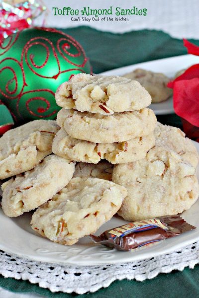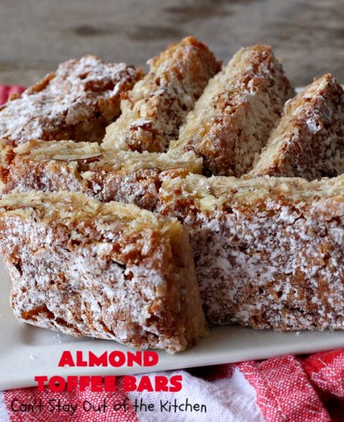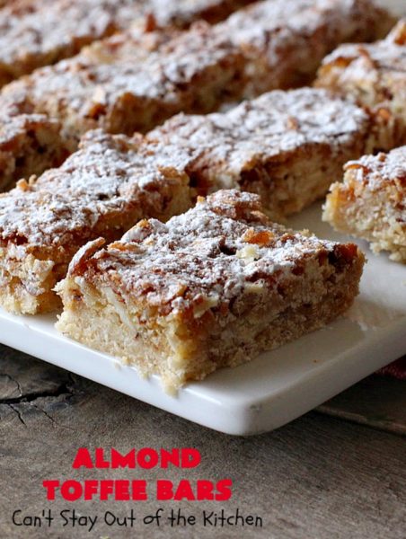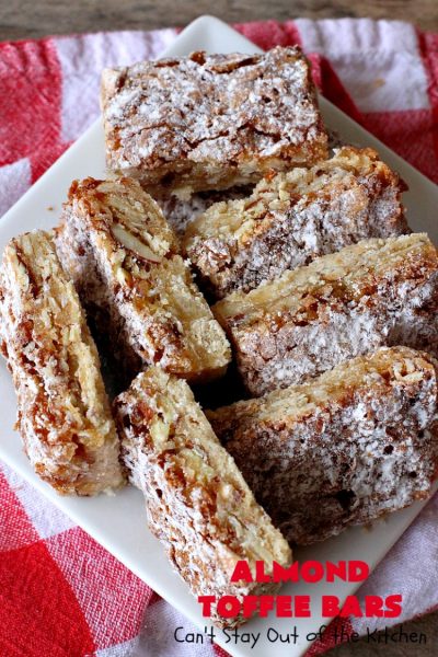 Almond Toffee Bars are absolutely spectacular. The bottom layer is like shortbread. Then the top layer combines toffee, coconut and almonds. After baking, the bars are sprinkled with powdered sugar. Yes, these bar-type cookies are so, so mouthwatering.