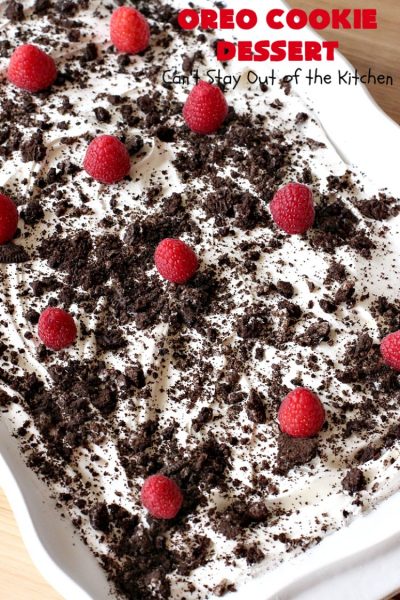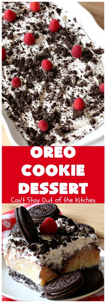 Regardless of when you make it, you’ve got to make this Oreo Cookie Dessert soon. All of your guests will be salivating. Don’t be surprised when everyone wants another piece of dessert….no matter how stuffed they are from a meal. š Yep, this dessert will certainly knock your socks off. So be prepared. This dessert is rich, decadent and addictive. Bring it on!