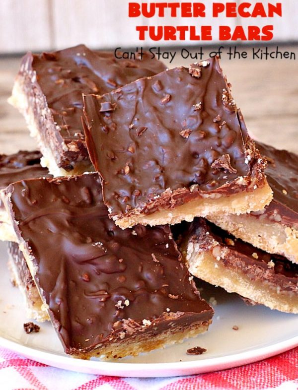 Butter Pecan Turtle Bars are marvelous. Seriously, these luscious brownie-type bars are chocolaty and addictive. They’re also pretty easy to make. The bars have a shortbread crust. Then they’re topped with a layer of pecans. Butter and brown sugar is caramelized on top of the stove. Then it’s poured over the pecan layer. After that layer is baked you spread chocolate chips over top. The chocolate chips soften. Then they’re spread over top so they make an icing. Every bite of chocolate and pecans will have you drooling.