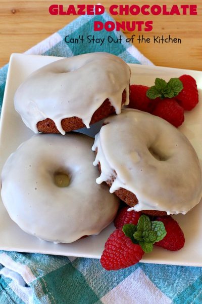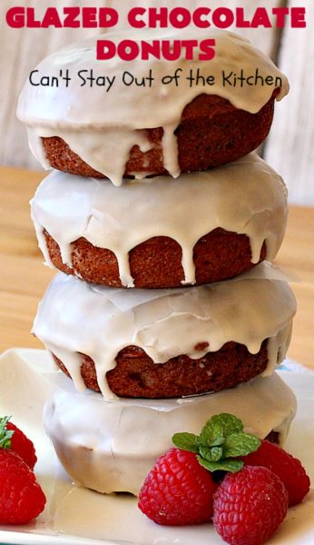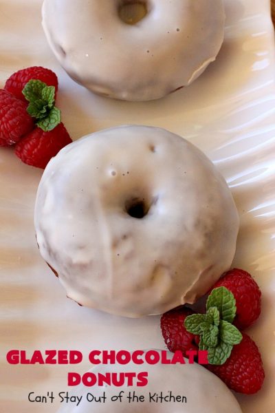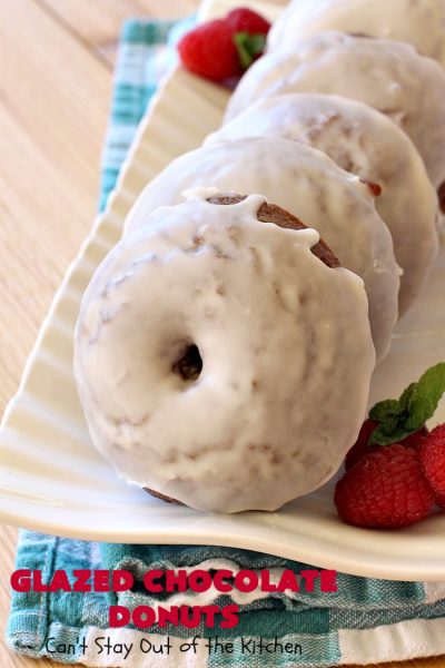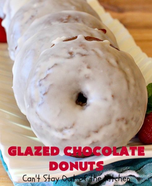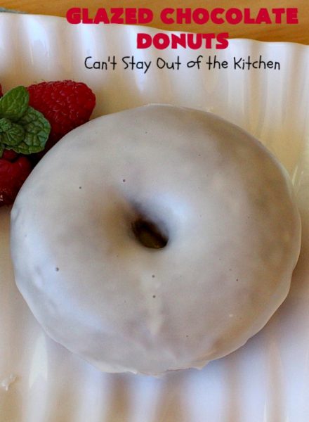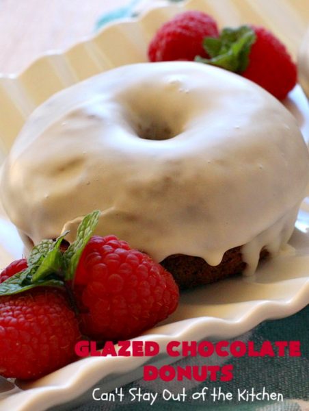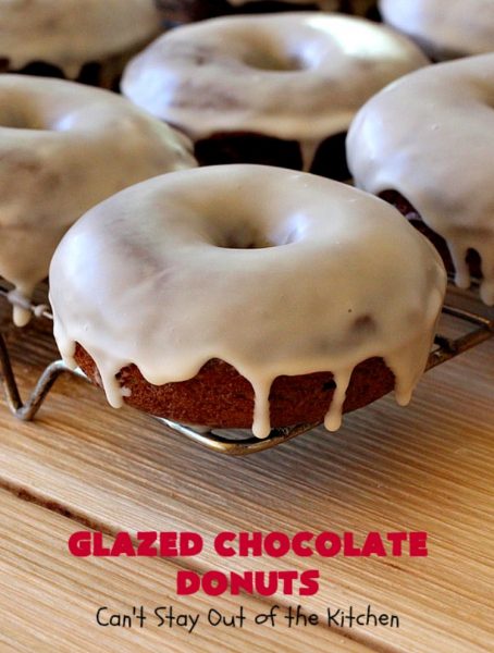 Glazed Chocolate Donuts are so awesome. These mouthwatering donuts are the ultimate in breakfast comfort food. I love donuts anyway, but chocolate donuts always get my motor revving. š These have an awesome vanilla glaze. First I dunked the donuts in the icing. Then I swirled the icing on the donut with the back of a spoon. Oh, yes, talk about drool worthy.