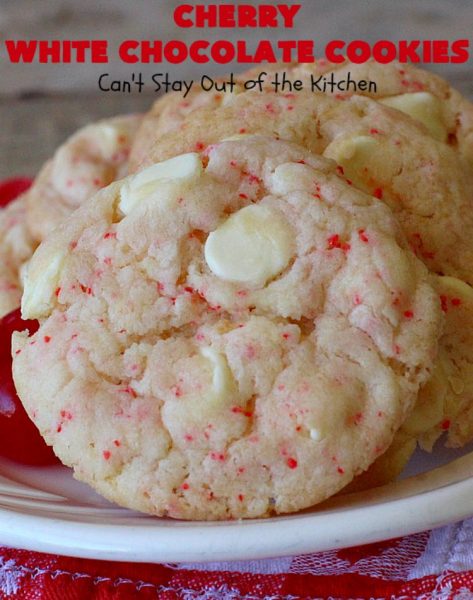 Cherry White Chocolate Cookies are oh, so scrumptious. These delicious jewels start with a Cherry Chip Cake Mix. They also include white chocolate chips (NOT vanilla chips). In total, there are only 4 ingredients!!! These cookies are so easy, so simple, yet utterly divine. š