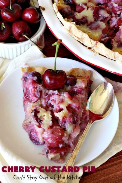 Cherry Custard Pie is irresistible. This luscious pie has cherries baked in a delicious custard sauce. It’s rich, sweet and outstanding. If you’re a cherry lover, this pie will rock your world!