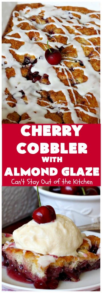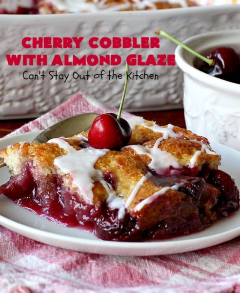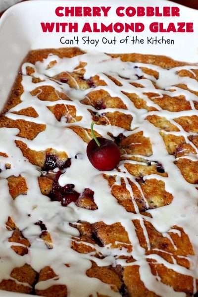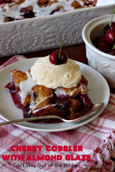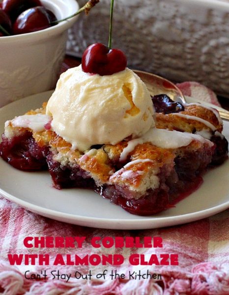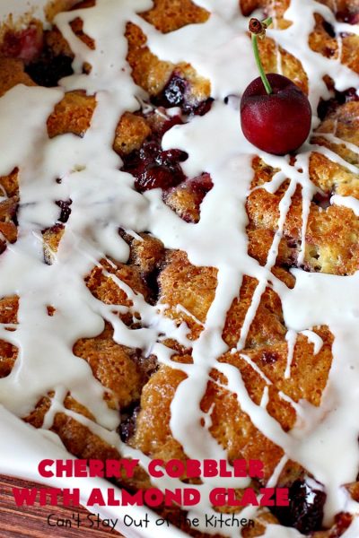 Cherry Cobbler with Almond Glaze is one fantastic dessert. This amazing dessert got rave reviews when I sent it out to John’s office a couple of weeks ago. There was not a smidgeon left!