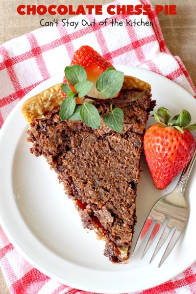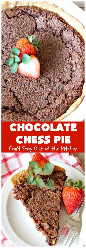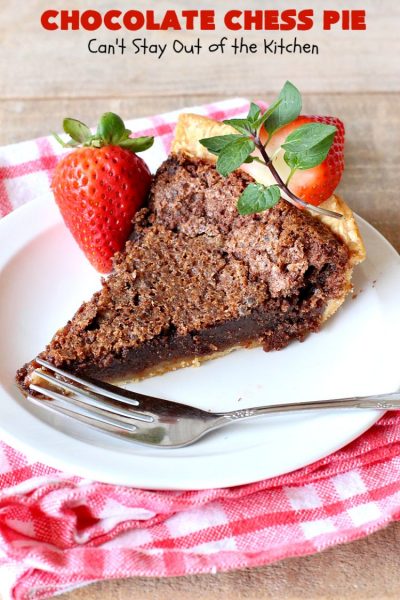 Chocolate Chess Pie is the most irresistible pie ever! I LOVE this pie. Think of a chocolate fudge type pie. This pie is so easy to make to. It uses only a handful of ingredients. It makes up rich and gooey like.