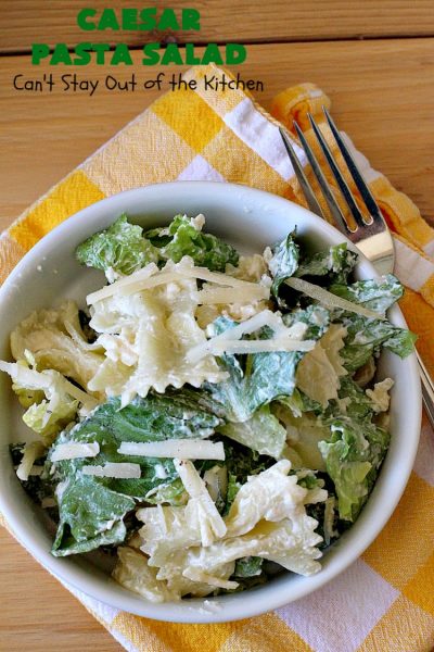 Caesar Pasta Salad is utterly delightful. This is a wonderful take on the traditional Caesar Salad recipe. This one has a simple homemade dressing and includes bow-tie pasta. You can garnish the salad with croutons, or leave them off if you prefer.