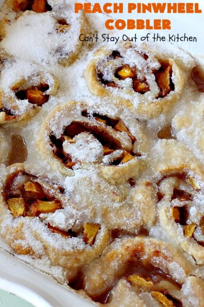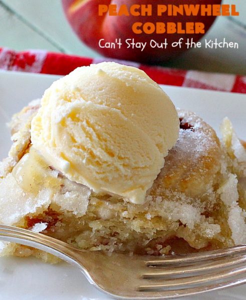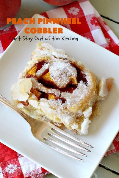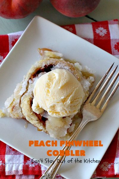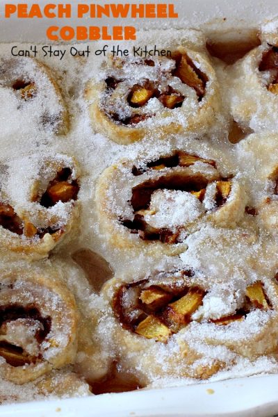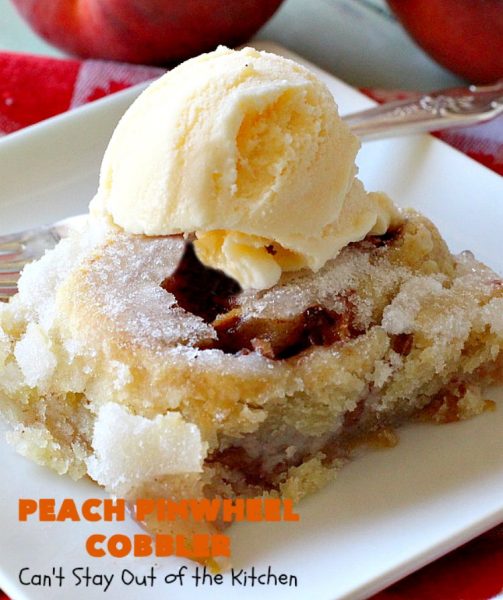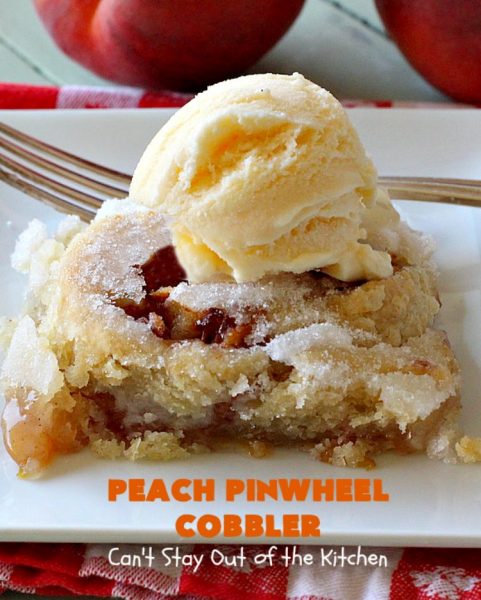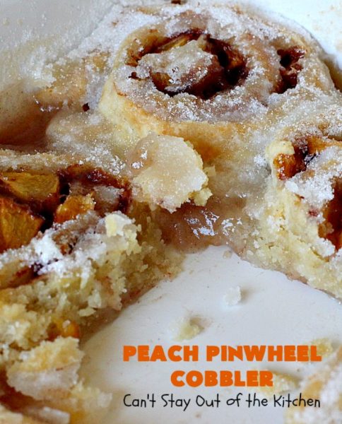 This is an extraordinary peach cobbler recipe. Before peach season ends, go out and get the ingredients so you can enjoy Peach Pinwheel Cobbler too. Don’t be surprised if your family cleans out the whole dish in one sitting. 🙂