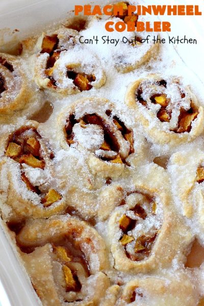 Peach Pinwheel Cobbler is awesome. Seriously. This luscious cobbler recipe is one you won’t get over fast. It’s a terrific dessert for summer and early fall when fresh peaches are still in season.