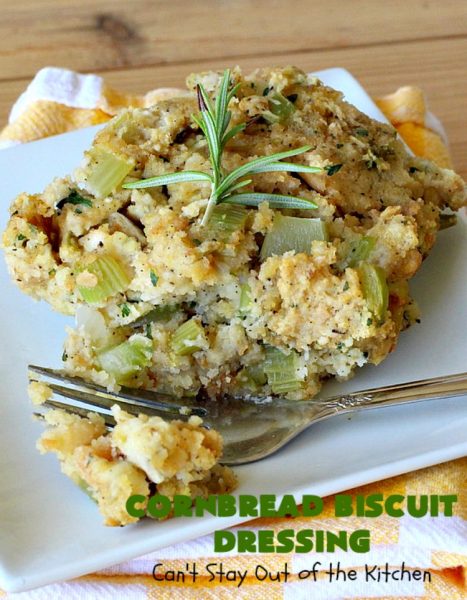Cornbread Biscuit Dressing is wonderful served with Turkey, Gravy, Broccoli Cheese Squares and Scalloped Corn and Bacon.
