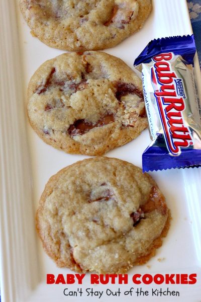Baby Ruth Cookies are some kind of scrumptious. If you enjoy Baby Ruth Bars, they are even more delicious in cookies. These luscious cookies are filled with the flavors of chocolate, caramel nougat and peanuts. Every bite is so amazing, you won’t want to stop eating them.