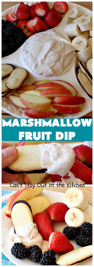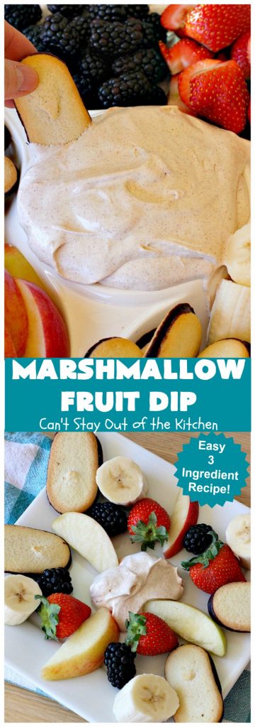 Marshmallow Fruit Dip is divine! This luscious three-ingredient dip is a terrific appetizer for any potluck or tailgating party. I served it with several kinds of fruit: strawberries, bananas, apples and blackberries. I also tossed in some Pepperidge Farm Milano Double Dark Chocolate Cookies. All were wonderful dippers for this sweet dip.