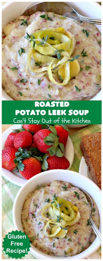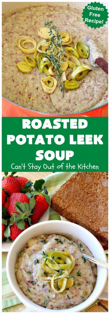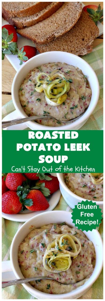 Roasted Potato Leek Soup is really fantastic for week night meals. I always make more than we need. That way I can have leftovers for lunch or dinner meals later in the week. Even though I sent home half of the soup and half of the bread with my son and his wife, there was still plenty for me. All of us enjoyed this soup. I hope you will too.