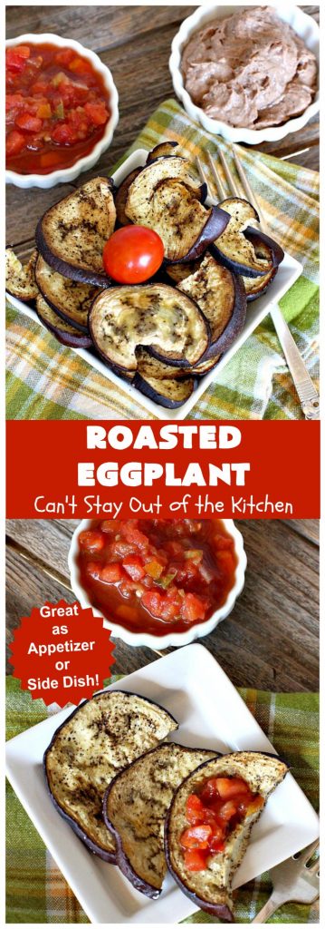 Roasted Eggplant is delightful for tailgating parties or potlucks when you’re looking for a healthy appetizer. Just add some salsa to serve it with and you’re good to go.