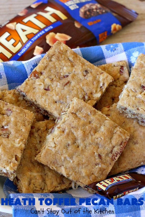 Heath Toffee Pecan Bars are marvelous for tailgating parties or potlucks.