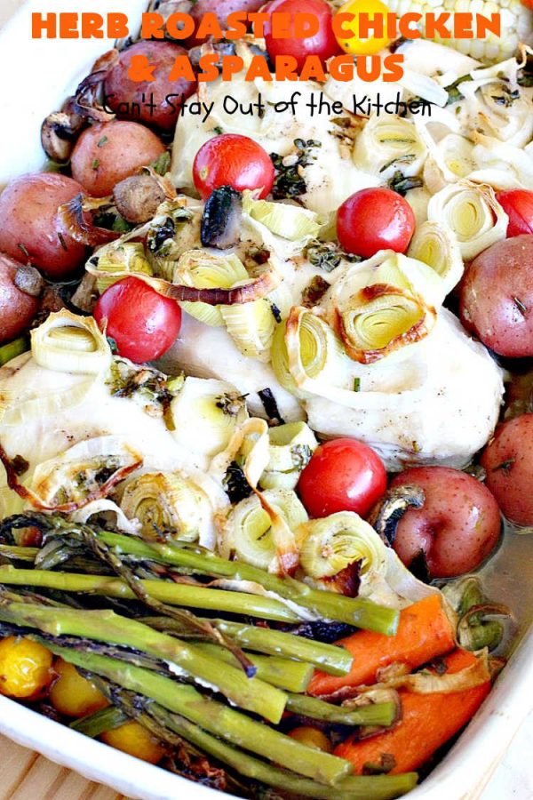 Herb Roasted Chicken and Asparagus is one of those lovely one-dish suppers that I love to make. Making everything in one casserole is so easy. You toss in the ingredients, sometimes pour a sauce or vinaigrette over top, and then bake. Simple, easy, quick.