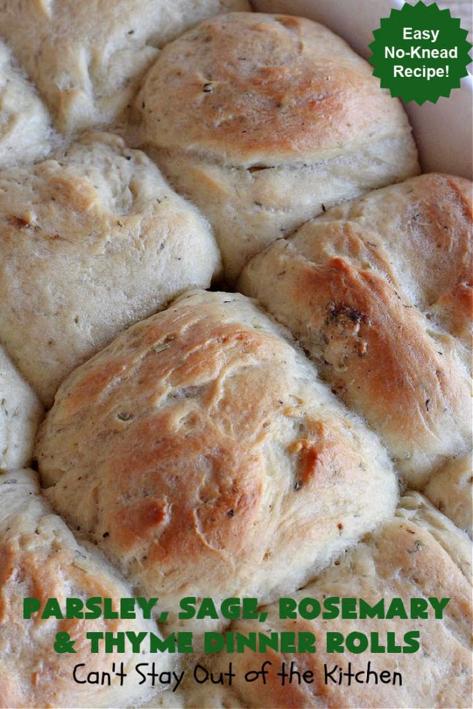 Parsley, Sage, Rosemary and Thyme Dinner Rolls have incredibly delicious flavor. I served these wonderful dinner rolls with Creamy Sweet Corn, Garlic Mashed Potatoes, Garlic Herb Parmesan Chicken Thighs and Watergate Fluff. Yum.