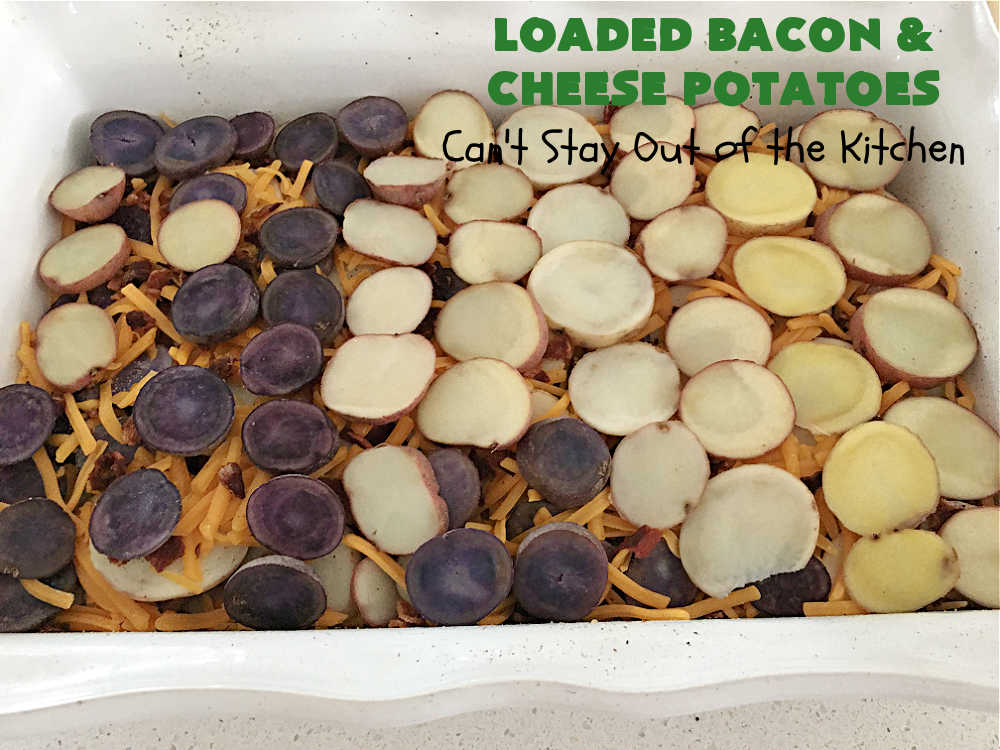 Loaded Bacon and Cheese Potatoes is a marvelous side dish. This delightful recipe uses a red, white and blue potato medley. Well, perhaps closer to red, yellow and blue! And, of course, there’s lots of cheese and bacon. It’s a terrific casserole dish for family, company or holiday dinners. And the nice thing about this casserole is that it reheats wonderfully, so you can enjoy leftovers during the week. š