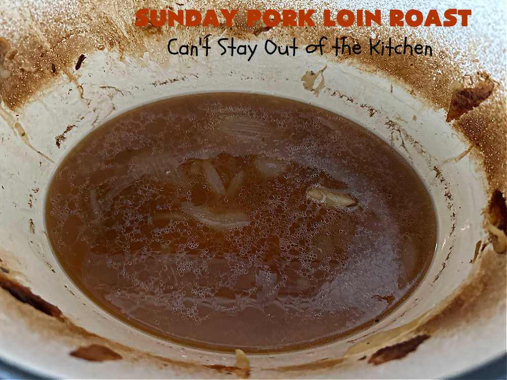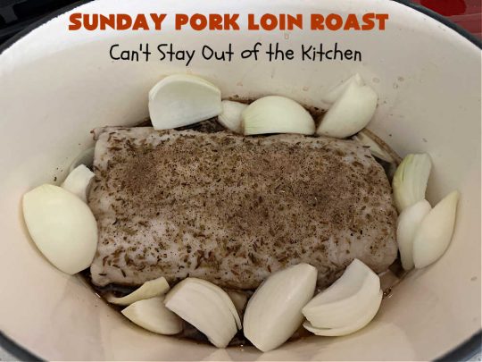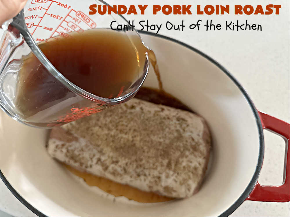 Put pork loin roast in a large roaster pan, cast-iron pan or enameled cast iron roaster (like shown above). Add beef broth.