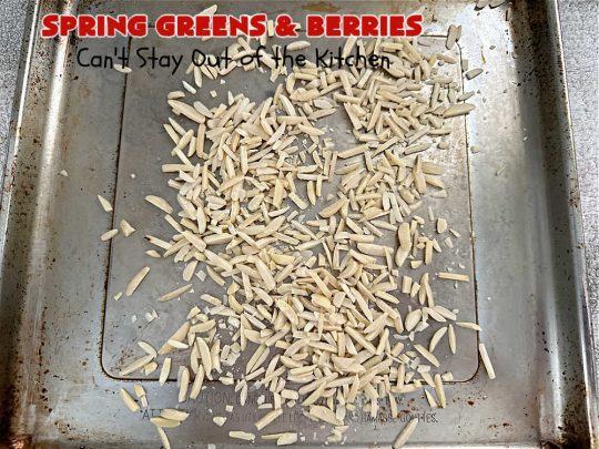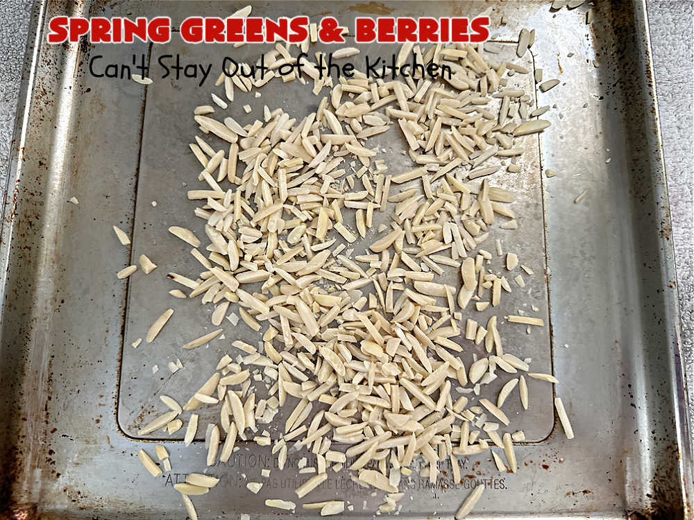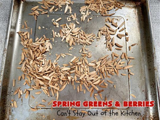 Bake at 350 degrees about 4-5 minutes until almonds are lightly browned. Remove from oven or toaster oven and set aside.