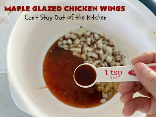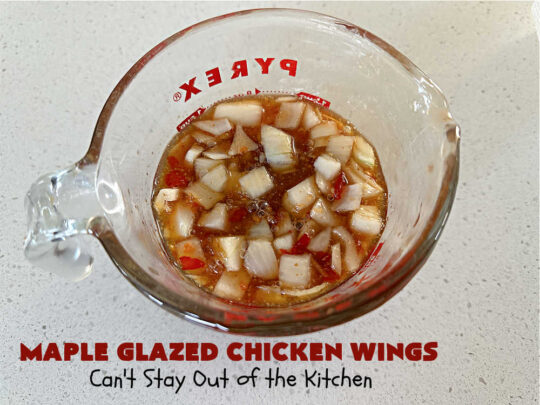 - Combine maple syrup, chili sauce, onion, mustard, Worcestershire sauce and red pepper flakes in a large mixing bowl.