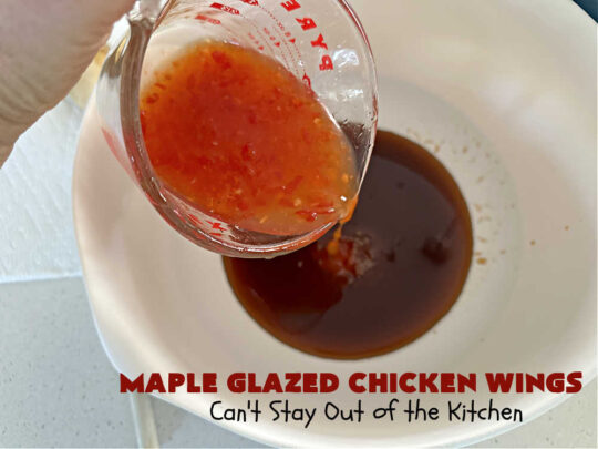 Place maple syrup, Honey Dijon mustard, red pepper flakes and chili sauce in a mixing bowl.