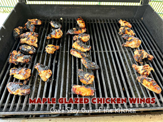 Maple Glazed Chicken Wings are scrumptious to serve either as an appetizer or a main dish. This easy 7-ingredient recipe is marinated in a delicious chili sauce-maple syrup marinade for a few hours and then tossed onto the grill to cook. The wings are basted with additional marinade while grilling. The chicken wings turn out wonderfully whether you serve them plain, or dip them in a honey-mustard sauce or a chipotle-style sauce. You’ll be licking your chops after every delicious bite!
