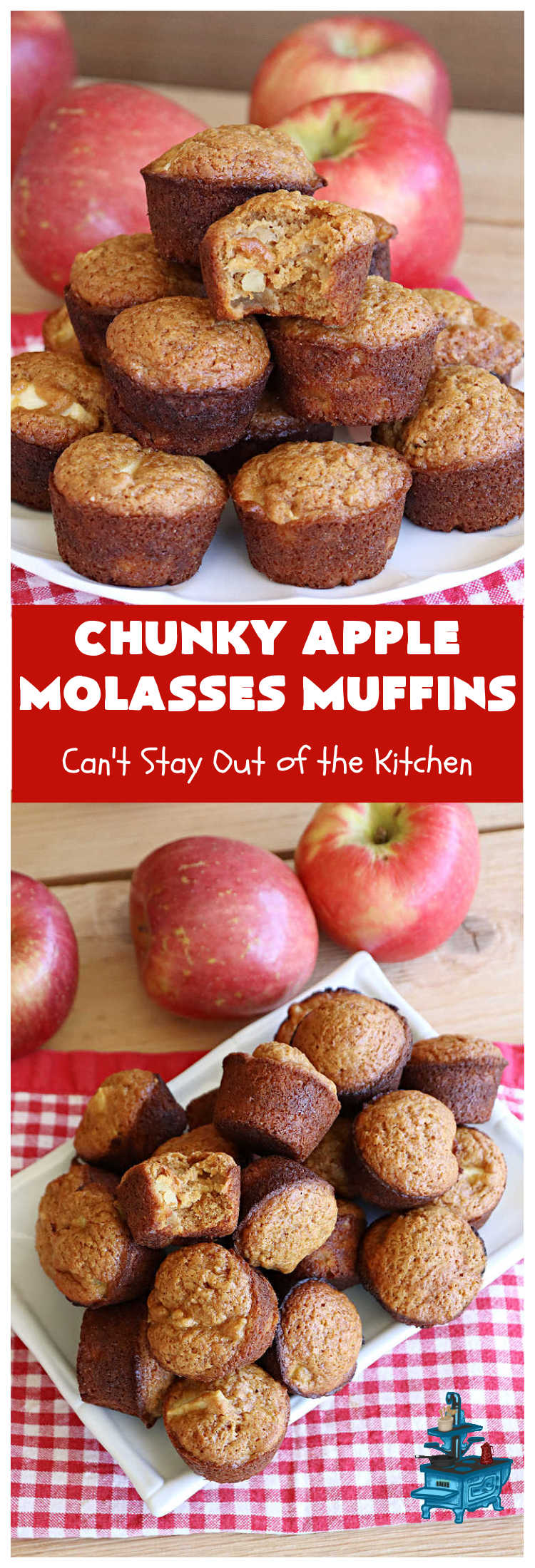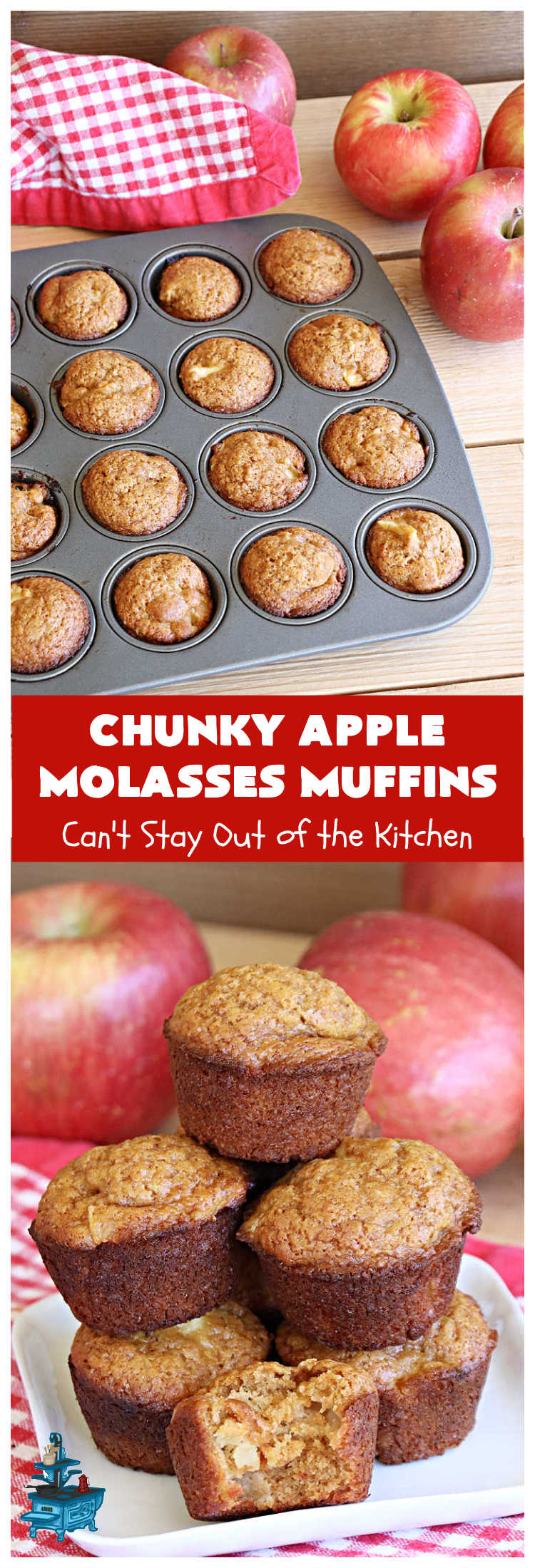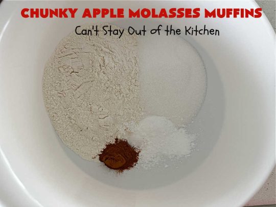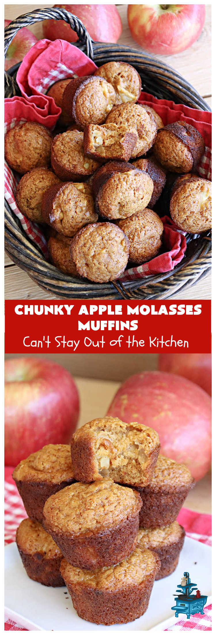 Chunky Apple Molasses Muffins is a vintage-style down-home recipe that’s perfect to spice up your day! These lovely muffins include chunks of apple, molasses and cinnamon providing texture and flavor that’s hard to beat. While I used Gala apples, you can use any apple you have on hand. I prefer sweeter apples and rarely use Granny Smiths or sour apples (even though they’re supposed to be better for baking). 😉