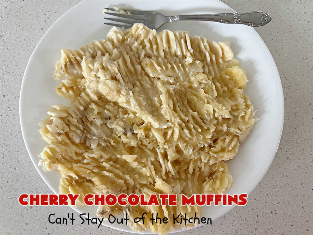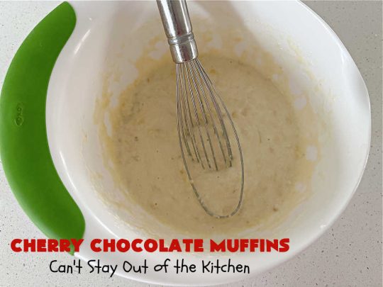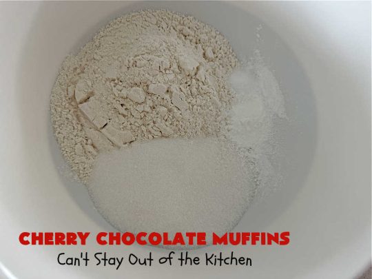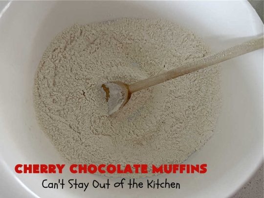I made these “knock-your-socks-off” muffins for our Sunday morning Hostess Committee at church back in early February. WOW, were they ever a hit. I mean, NO ONE could stay out of them. I made a lot of them and almost everyone wanted two or three of them! No kidding. 🙂 I kept getting comments about how they enjoyed cherries with chocolate. Plus, the muffins seemed to melt in everyone’s mouth! These were probably one of the most enjoyed recipes I’ve made for our church’s ushers and greeters. They literally couldn’t keep out of them.
