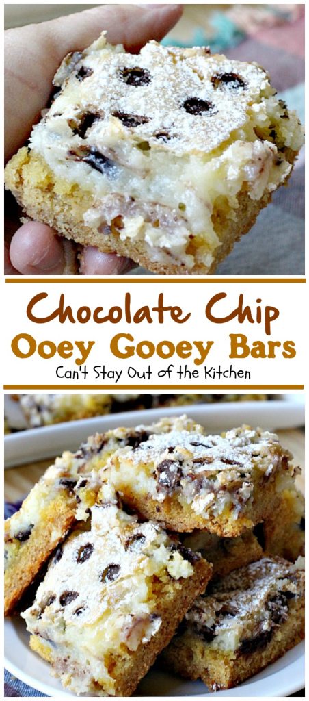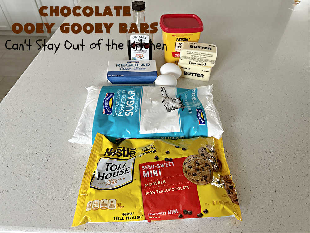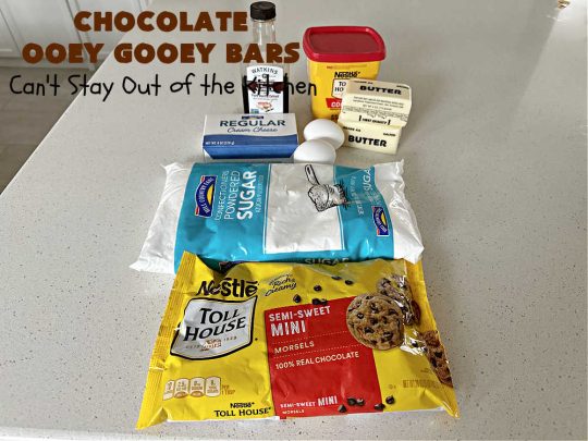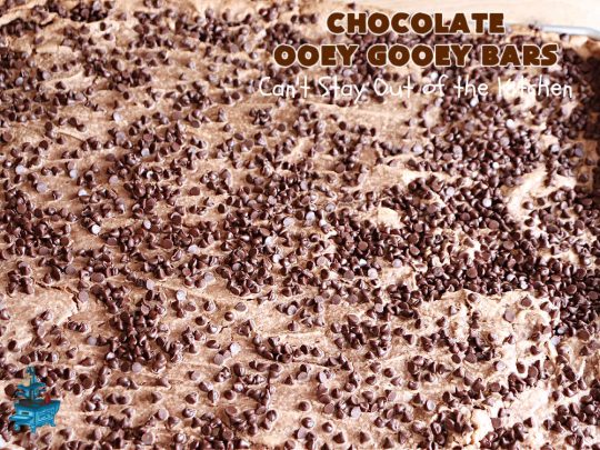 Chocolate Ooey Gooey Bars. Let that sink in. š These delicious Ooey Gooey Bars feature not only chocolate chips, but a chocolate cheesecake batter as well. They are absolutely outstanding and a fantastic dessert to make anytime of the day or year. They’re especially good for holidays, or serve them at tailgating parties, potlucks, or Backyard Barbecues. But whatever you do, just serve them!