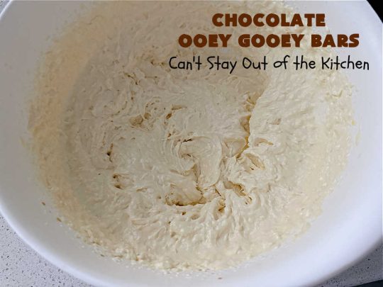 For those of you who have never made Ooey Gooey Bars before, this is a layered dessert. The crust is made with a chocolate cake mix (I used Devil’s Food), an egg and melted butter. The cheesecake layer includes cream cheese, powdered sugar, eggs, vanilla and cocoa. The top layer is miniature chocolate chips. It’s a spectacular dessert anyway, but if you’re a chocolate lover, this chocolaty dessert will rock your world! Enjoy every bite. š
