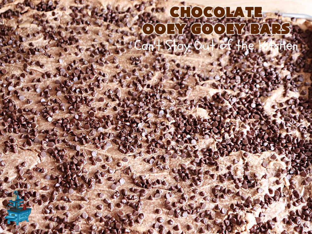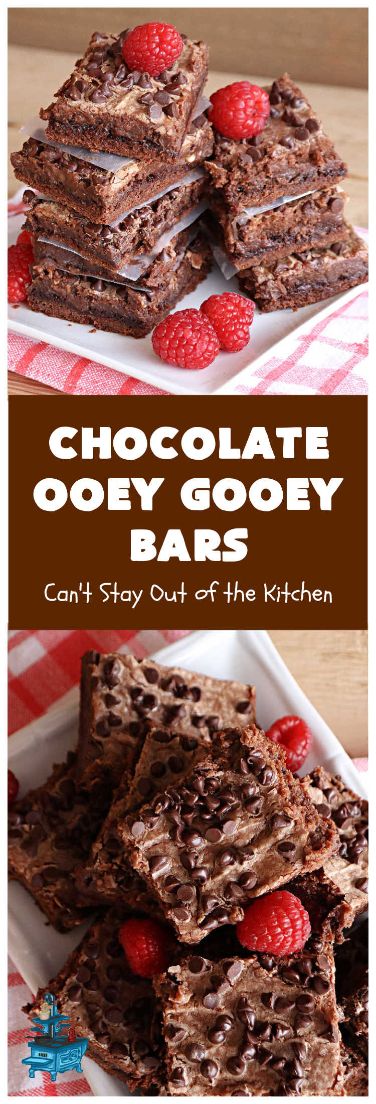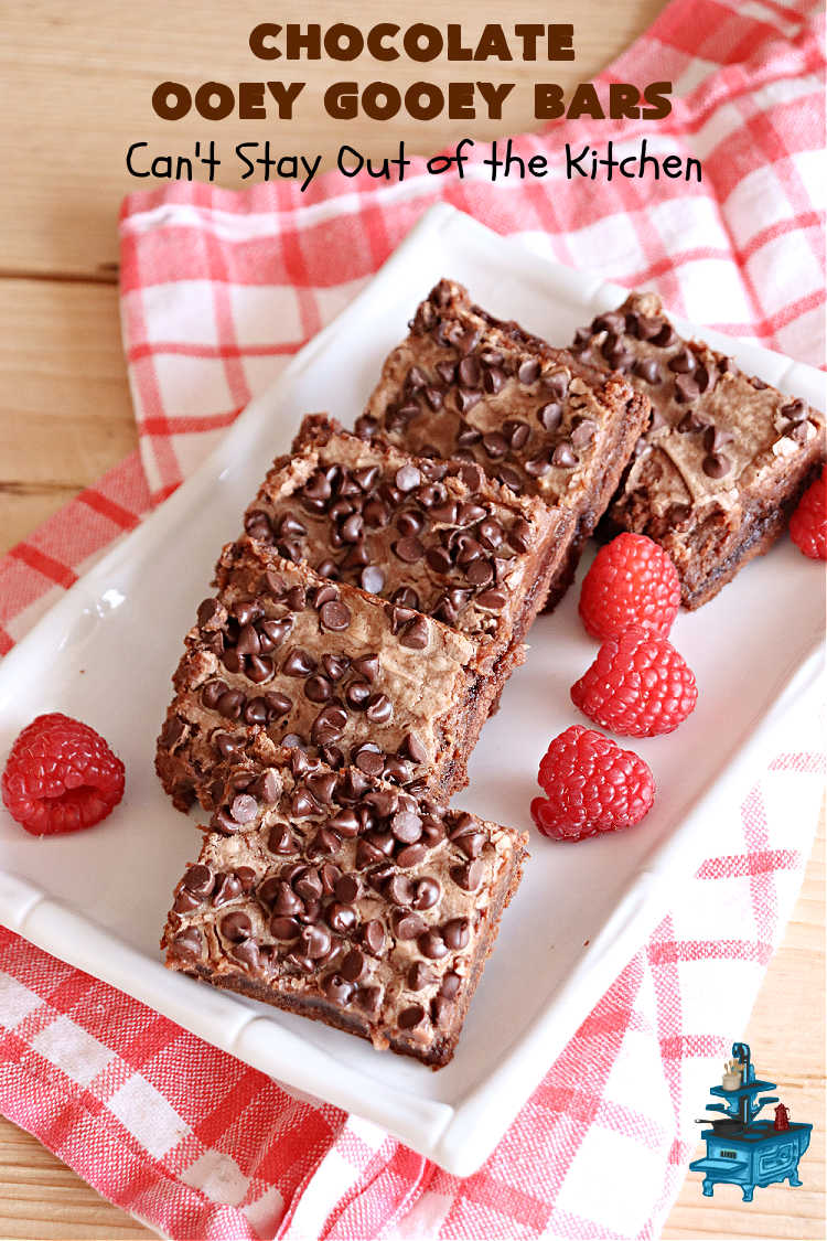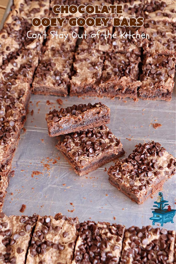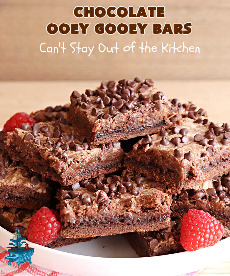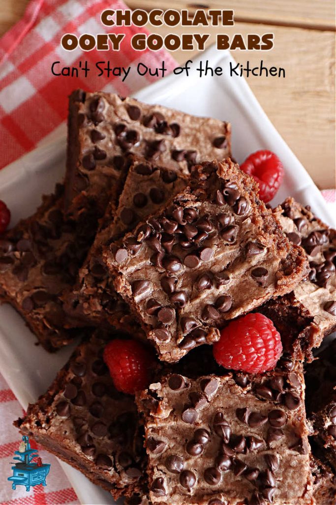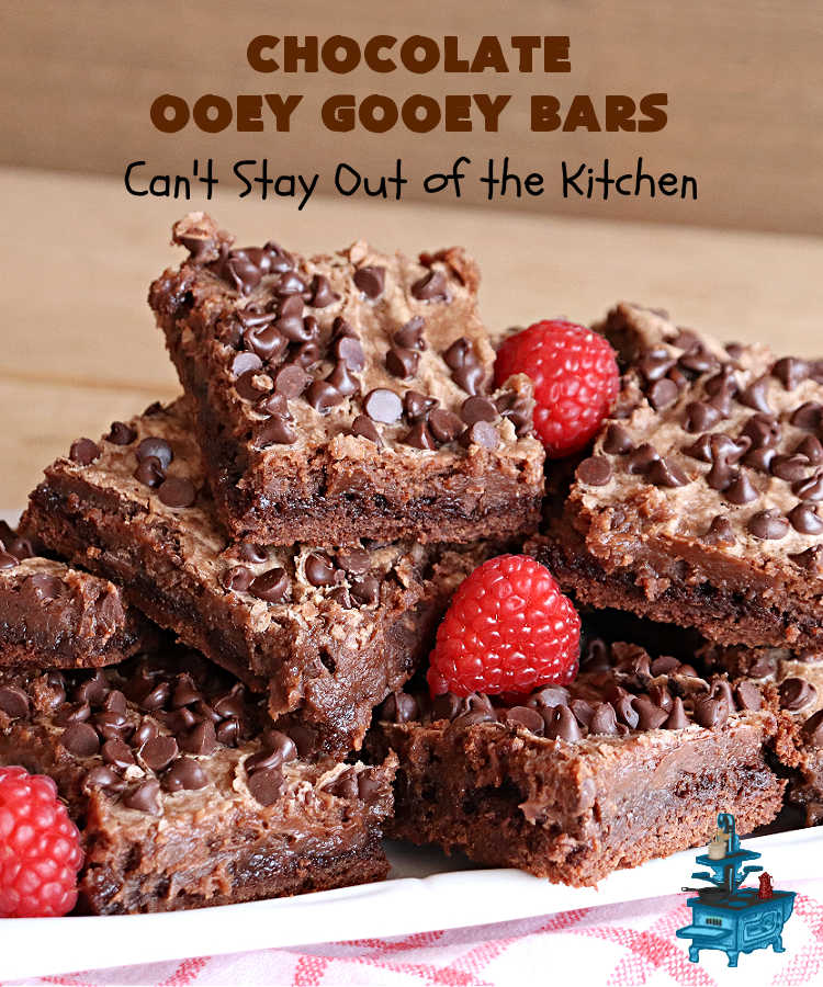 Chocolate Ooey Gooey Bars are terrific for tailgating parties, potlucks and Backyard Barbecues.