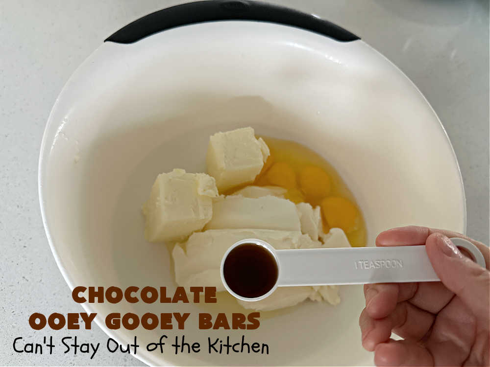Soften butter and cream cheese. (You can also melt the butter. See notes in recipe card below). Place in a large mixing bowl with eggs and vanilla.