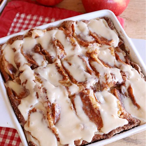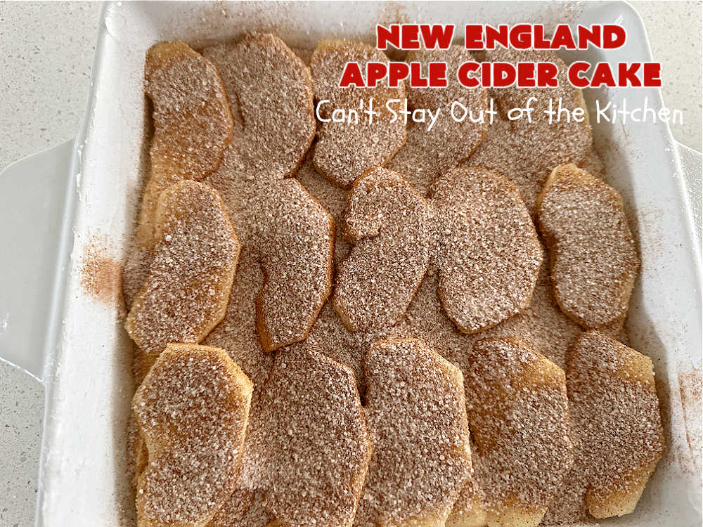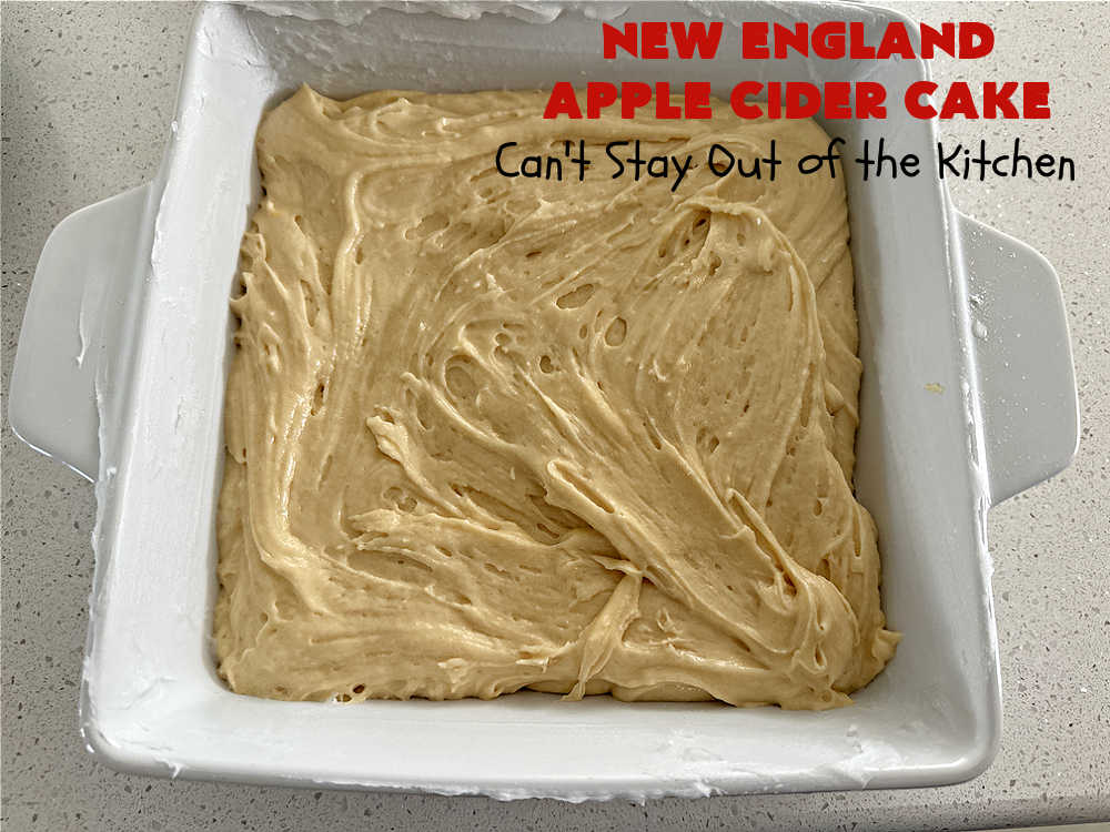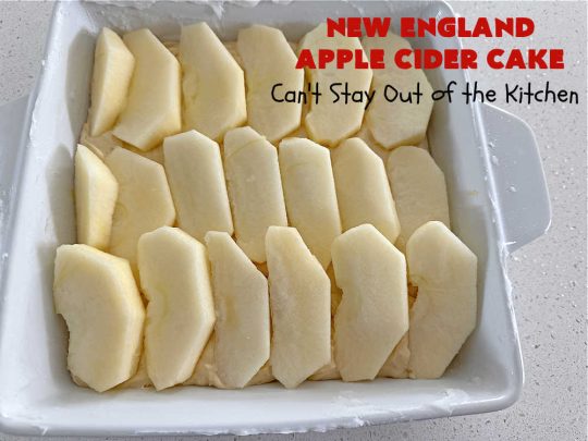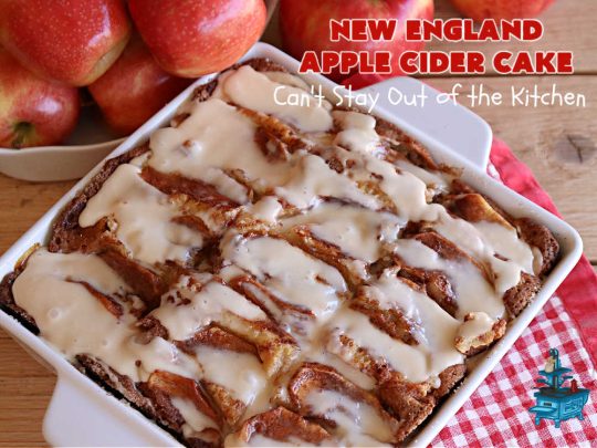 New England Apple Cider Cake is made by spooning the batter into a 9×9″ baking dish. The batter is topped with apple slices, then a cinnamon-sugar mixture is sprinkled over top before baking. After baking, the cake is iced with rich, luscious Apple Cider Glaze. Yum. 🙂 We, and all we served this cake to, were wonderfully impressed with this jewel of a recipe. I hope you will be too.