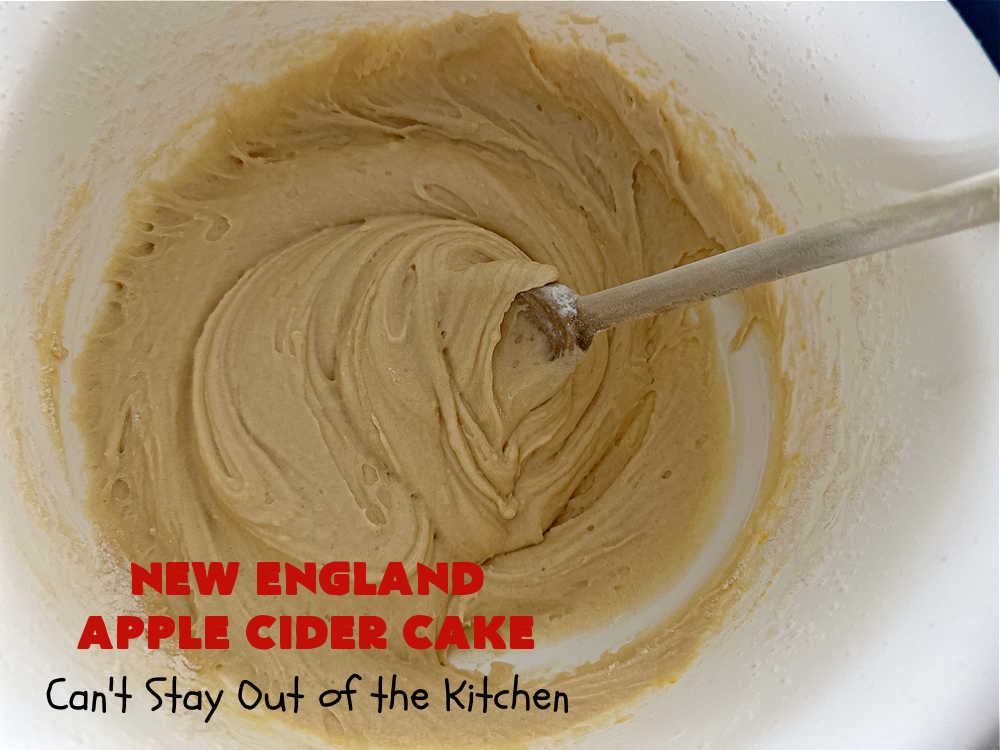 Add flour mixture and apple cider mixture alternately to the egg mixture. (Do this in two or three batches and mix each time with a wooden spoon.