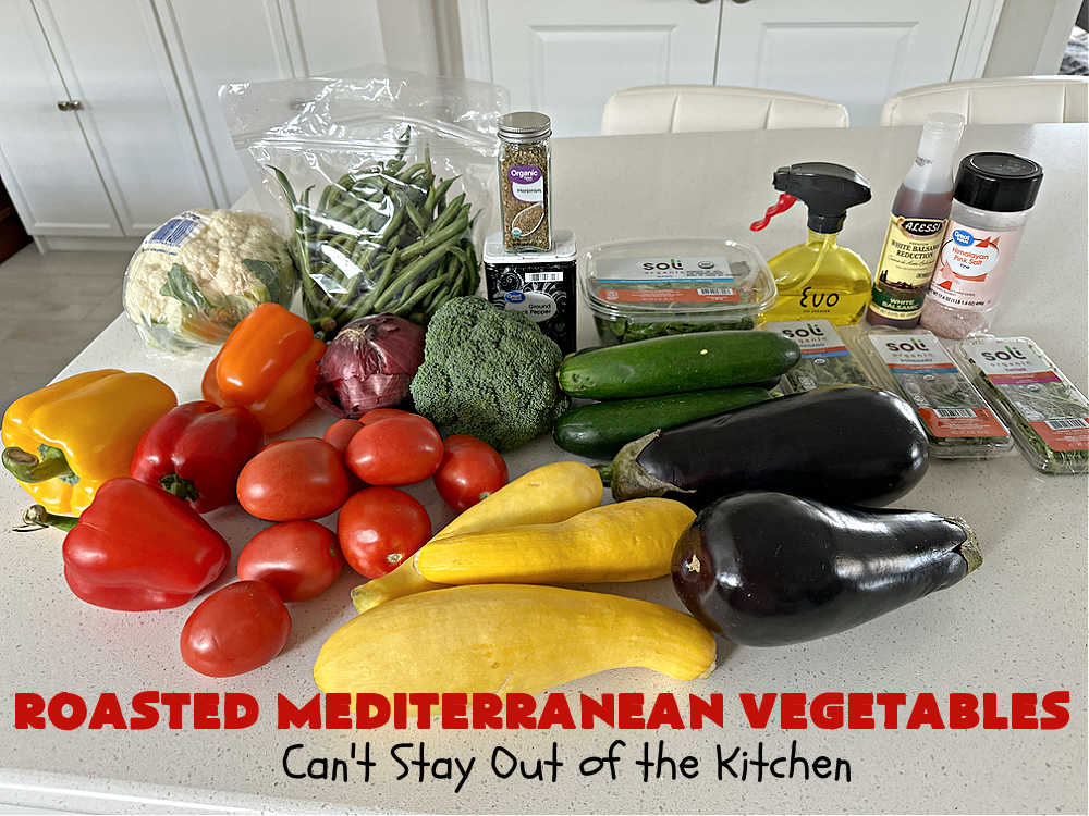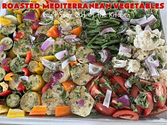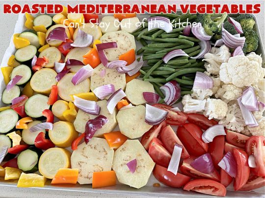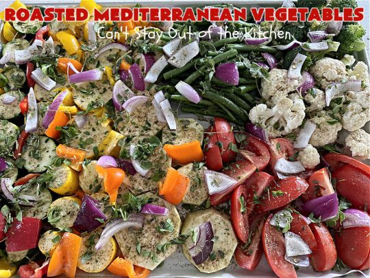When it comes to Mediterranean style food – I’m all in! I especially enjoy Mediterranean style salads and vegetables. Whether it’s a main dish or a meatless dish, I’m always up for it. My favorite is Greek, and we usually visit there almost weekly! š This delicious side dish includes eggplant, both yellow and zucchini squashes, Roma tomatoes, green beans, broccoli, cauliflower and several colors of bell peppers. It’s seasoned with fresh herbs and then drizzled with olive oil and white balsamic vinegar before roasting. The end product is really tasty–not to mention that it’s a great side dish for any entree.