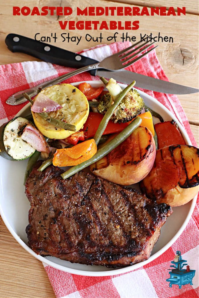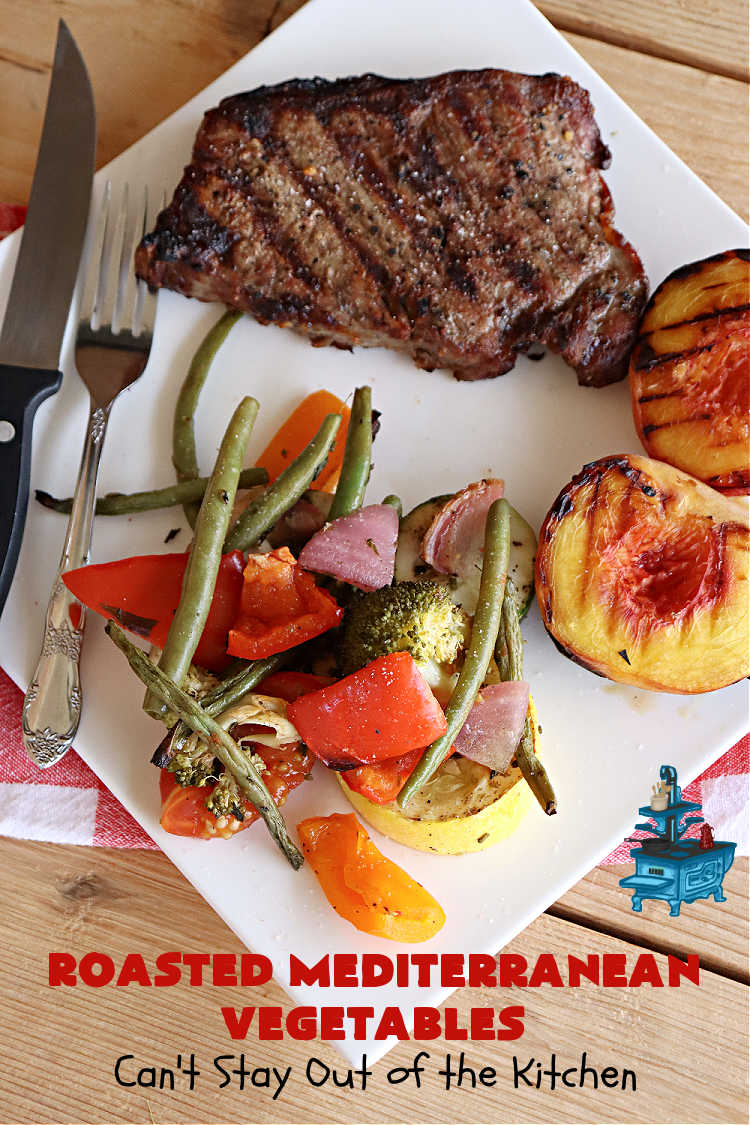 I served Roasted Mediterranean Vegetables with Steak and Grilled Peaches.