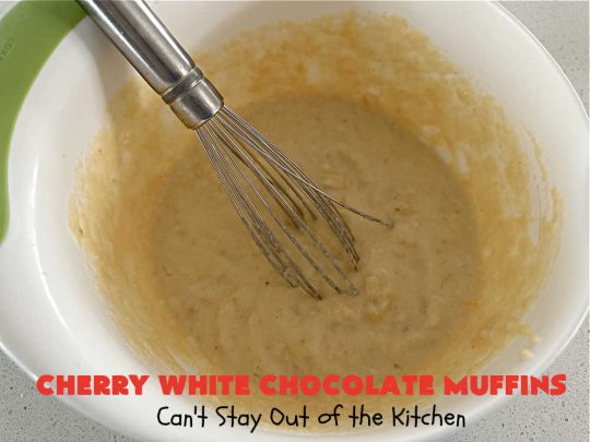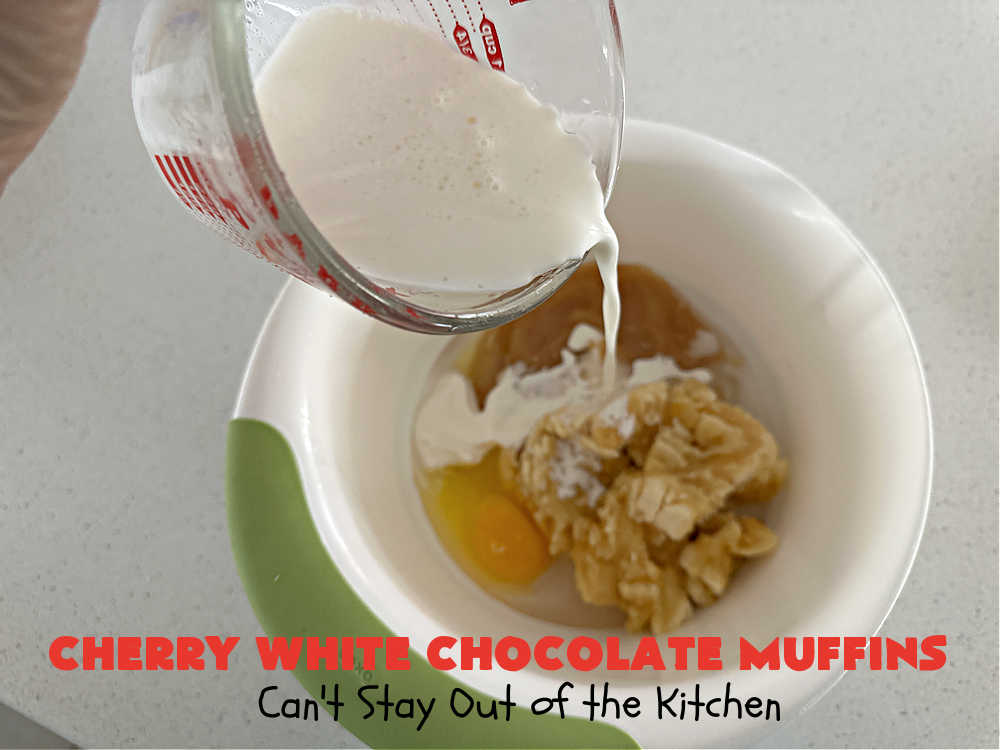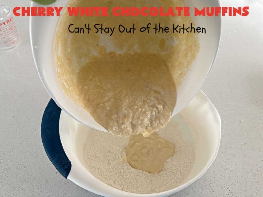 - Add wet ingredients to dry ingredients along with white chocolate chips and cherries.