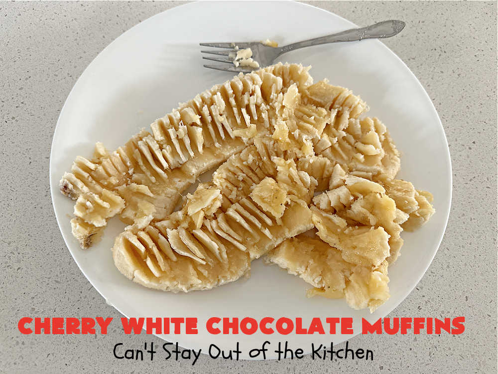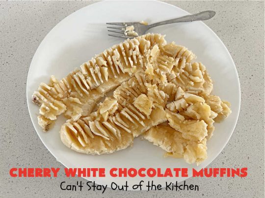 I hit the gold mine with this scrumptious recipe. If you think cherries and chocolate go together well, try cherries with white chocolate some time. š Cherry White Chocolate Muffins are sensational. The muffins are filled with candied cherries, white chocolate chips (REAL white chocolate, NOT premiere white baking chips or vanilla chips which have NO chocolate!), applesauce and bananas. They’re moist, flavorful and filled with cherries and white chocolate in every bite.