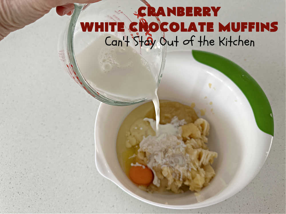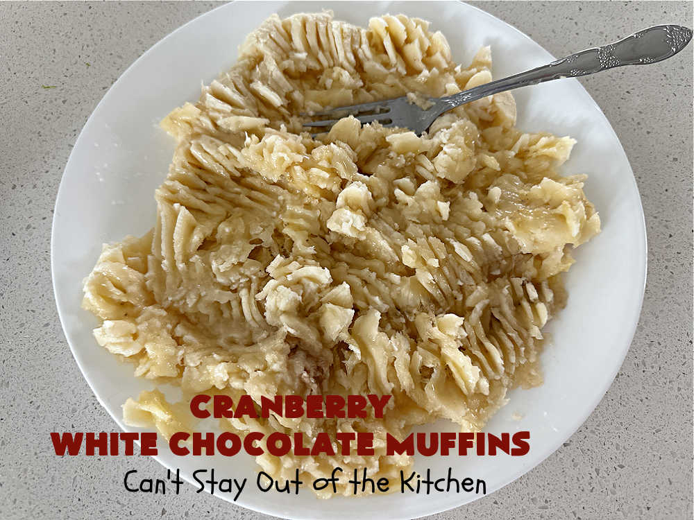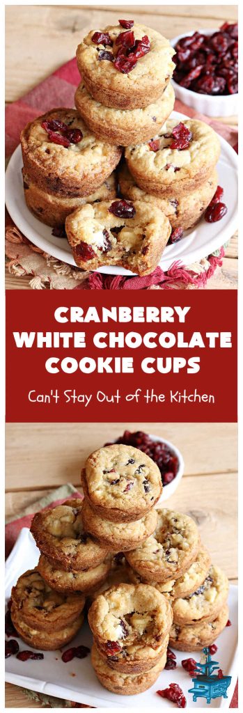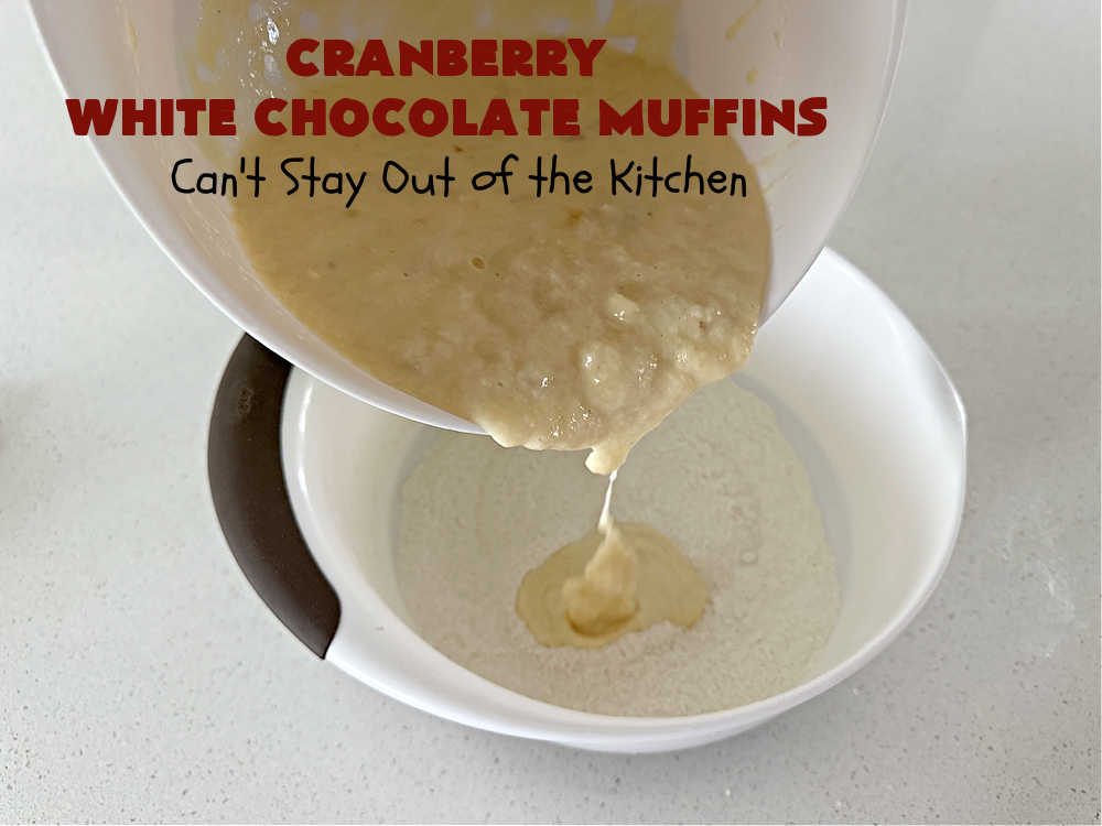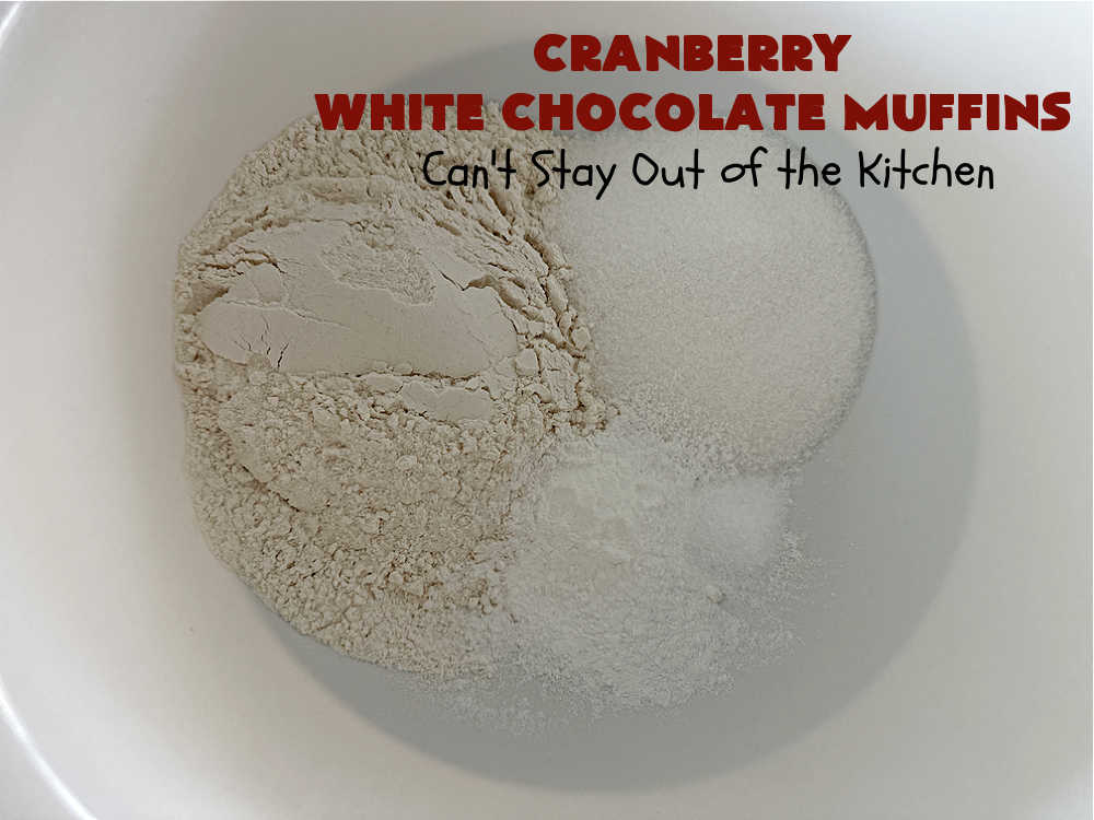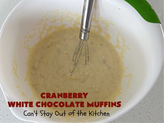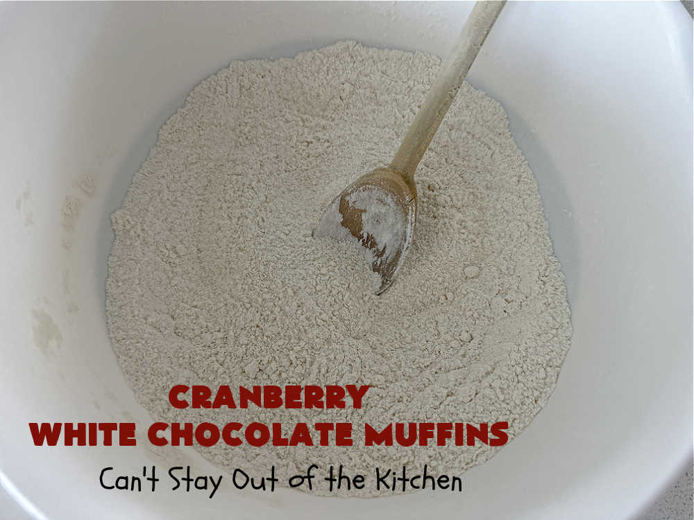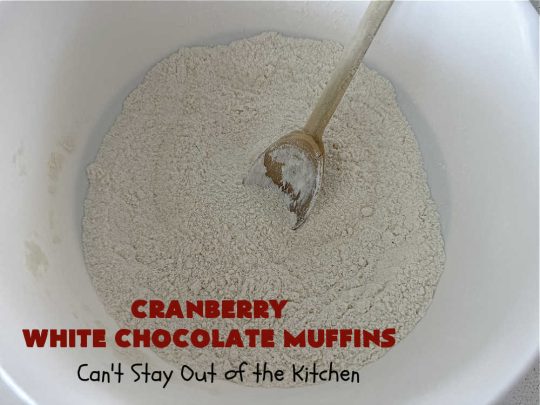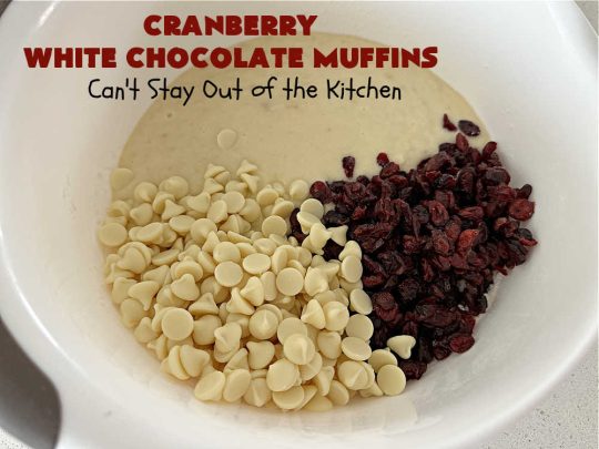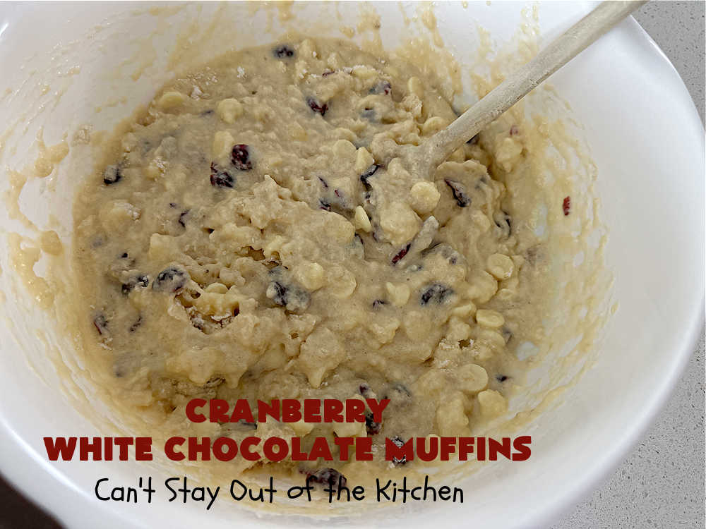 These lovely muffins are filled with dried cranberries and REAL white chocolate chips–not vanilla chips or premiere white baking chips which have no cocoa in them.