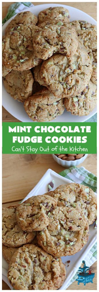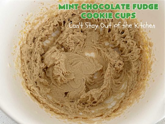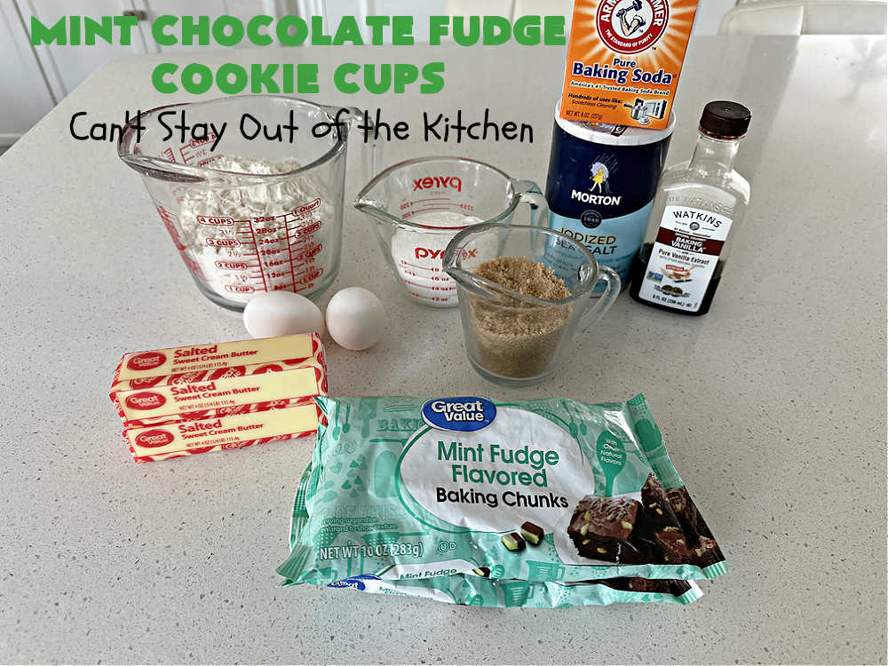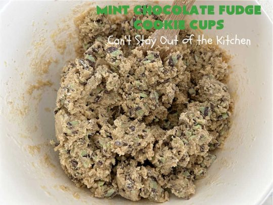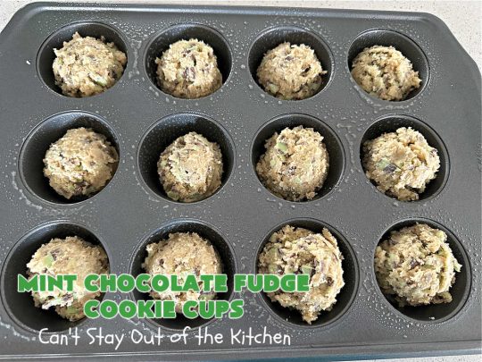 We buy these wonderful mint fudge flavored baking chunks regularly at Walmart. They are terrific to use in Tea Cakes, cookies, brownies, brownie cups, muffins and all things sweet (including gluten free goodies)! They were certainly wonderful in these Mint Chocolate Fudge Cookie Cups. These cookie cups start with one of my favorite Chocolate Chip Cookie recipes but I swapped out mint fudge flavored baking chunks for the chocolate chips instead.
