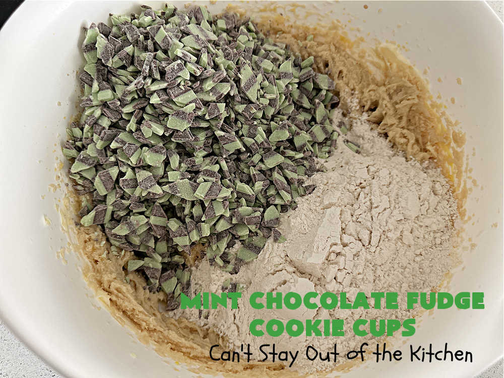 - Add flour and mint fudge-flavored baking chips and stir until thoroughly mixed and no crumbs remain.