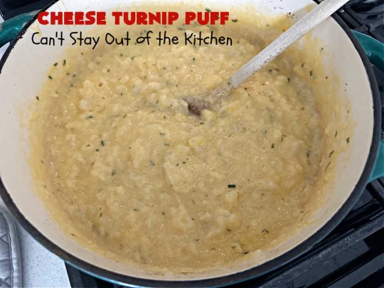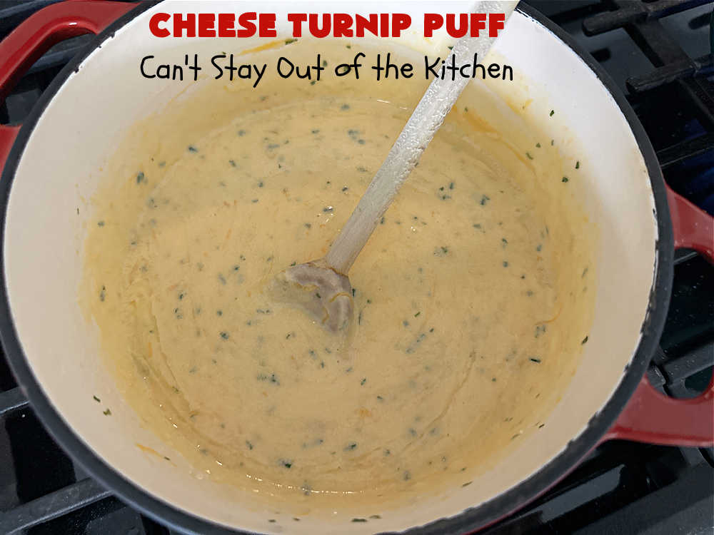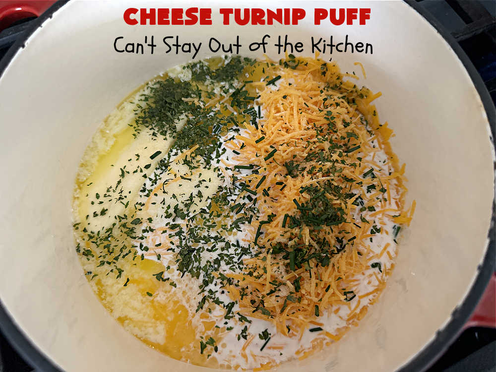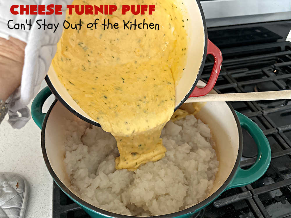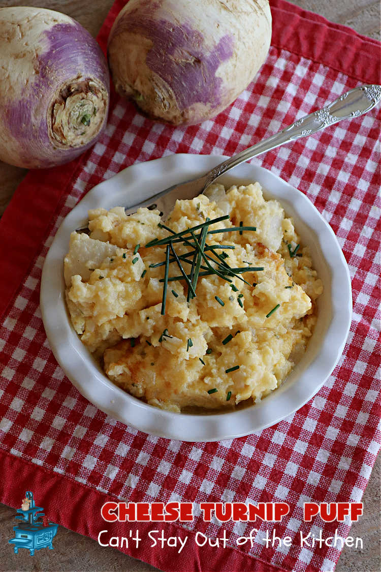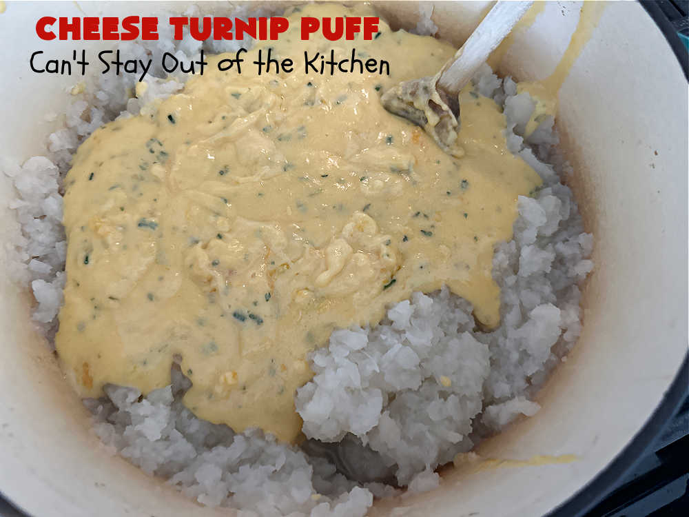 Cheese Turnip Puff uses a sharp cheddar cheese, chives, garlic powder and parsley. But you can certainly add more seasonings like dill weed in the casserole and paprika on top before baking. You can also stir in cooked bacon or ham and grilled onions, garlic or leeks before baking. All of those are excellent choices to amp up the desirability of this fibrous vegetable.