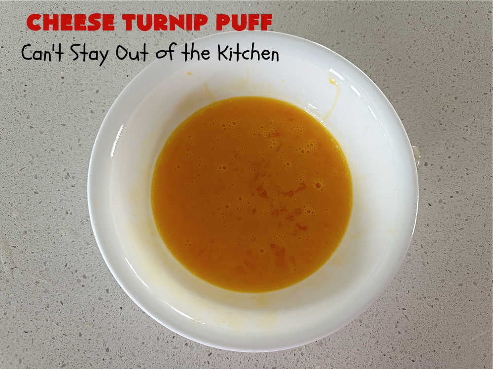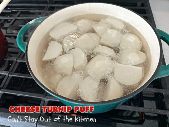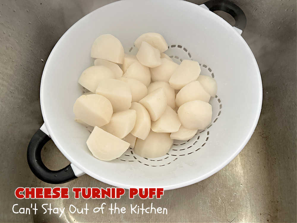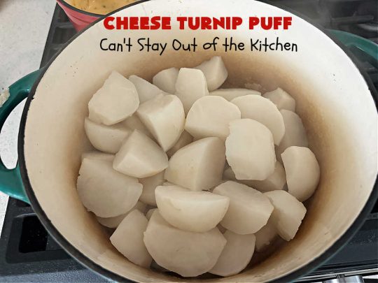 Cheese Turnip Puff is an excellent way to enjoy turnips! This much maligned vegetable has many health benefits. Those include cancer prevention, bone health, boosts immunity, weight loss, digestive health, heart health, and as an antioxidant. Since it’s loaded with lutein it’s an excellent preventative to ward off macular degeneration, cataracts and other diseases of the eye. It’s one of those vegetables that has a lot of potential in casseroles, soups and even by itself.