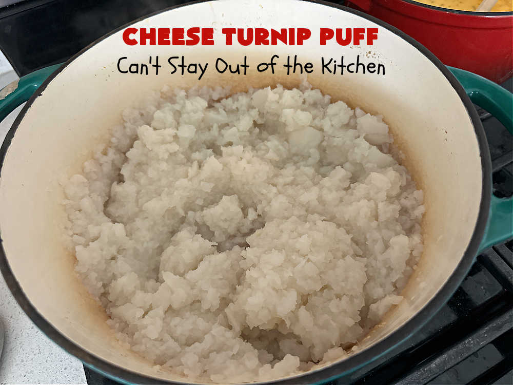 - Once turnips are mashed, stir cheese mixture into the drained, mashed turnips.